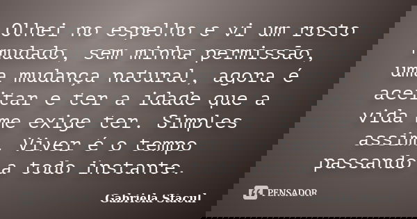 Olhei no espelho e vi um rosto mudado, sem minha permissão, uma mudança natural, agora é aceitar e ter a idade que a vida me exige ter. Simples assim. Viver é o tempo passando a todo instante.