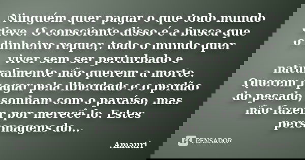 Ninguém quer pagar o que todo mundo deve. O consciente disso é a busca que o dinheiro requer, todo o mundo quer viver sem ser perturbado e naturalmente não querem a morte. Querem pagar pela liberdade e o perdão do pecado, sonham com o paraíso, mas não fazem por merecê-lo. Estes personagens do cenário da vida chamado gente, brincam de contar verdades e contam muito mais que mentiras. Mesmo não gostando nem aceitando as mentiras e enganos; os personagens homens e os mitos representam os conceitos e os preconceitos da humanidade com relação direta às influências peculiares dos meios sociais.