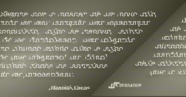 Sempre com o nascer de um novo dia, brota em meu coração uma esperança de conquista, algo se renova, sinto minha fé se fortalecer, uma alegria duradoura inunda minha alma e sigo confiante que chegarei ao final dele distribuindo todos os sorrisos que a vida me presenteou.