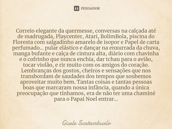 de madrugada, Playcenter, Atari, BolimBola, piscina do Floresta com salgadinho amarelo de isopor e Papel de carta perfumado... pular elástico e dançar na enxurrada da chuva, manga bufante e calça de cintura alta,diário com chavinha
