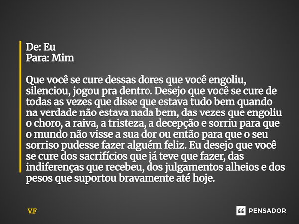Que você se cure dessas dores que você engoliu, silenciou, jogou pra dentro. Desejo que você se cure de todas as vezes que disse que estava tudo bem quando na verdade não estava nada bem, das vezes que engoliu o choro, a raiva, a tristeza, a decepção e sorriu para que o mundo não visse a sua dor ou então para que o seu sorriso pudesse fazer alguém feliz. Eu desejo que você se cure dos sacrifícios que já teve que fazer, das indiferenças que recebeu, dos julgamentos alheios e dos pesos que suportou bravamente até hoje.
