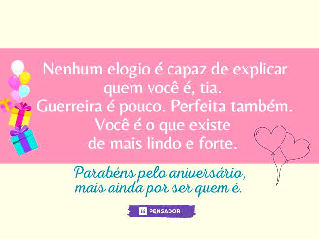 Parabéns para esta tia que ilumina até mesmo os dias mais escuros com seu sorriso sincero e sua personalidade inestimável. Para mim, você é incrível e uma inspiração na minha vida. Felicidades, hoje e sempre!