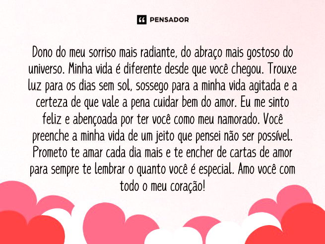 Dono do meu sorriso mais radiante, do abraço mais gostoso do universo. Minha vida é diferente desde que você chegou. Trouxe luz para os dias sem sol, sossego para a minha vida agitada e a certeza de que vale a pena cuidar bem do amor. Eu me sinto feliz e abençoada por ter você como meu namorado. Você preenche a minha vida de um jeito que pensei não ser possível. Prometo te amar cada dia mais e te encher de cartas de amor para sempre te lembrar o quanto você é especial. Amo você com todo o meu coração!