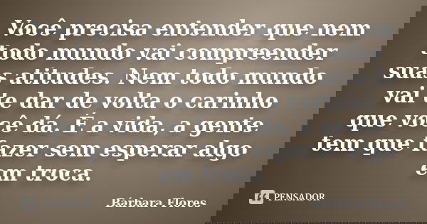 Você precisa entender que nem todo mundo vai compreender suas atitudes. Nem todo mundo vai te dar de volta o carinho que você dá. É a vida, a gente tem que fazer sem esperar algo em troca.