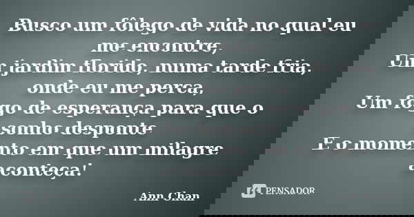 Busco um fôlego de vida no qual eu me encontre, Um jardim florido, numa tarde fria, onde eu me perca, Um fogo de esperança para que o sonho desponte E o momento em que um milagre aconteça!