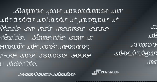 Sempre que apontamos um defeito alheio é porque é alheio em nós mesmos esse defeito. Somente com a compreensão de nós mesmos, desintegra-se aos poucos esse mau hábito.