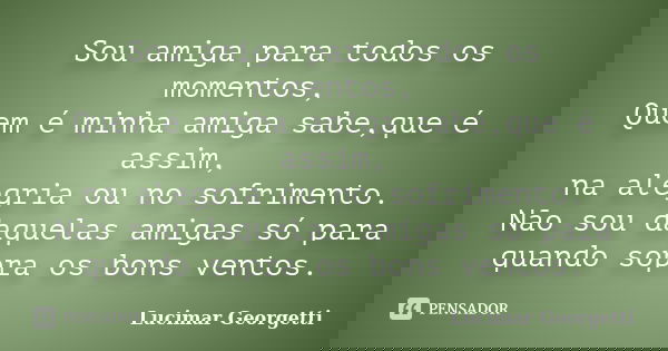 Sou amiga para todos os momentos, Quem é minha amiga sabe,que é assim, na alegria ou no sofrimento. Não sou daquelas amigas só para quando sopra os bons ventos.