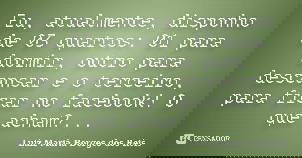 Eu, atualmente, disponho de 03 quartos: 01 para dormir, outro para descansar e o terceiro, para ficar no facebook! O que acham?...