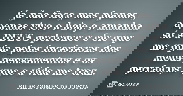 já não faço mas planos, apenas vivo o hoje o amanha só a DEUS pertence e ele que me guia pelas incertezas dos meus pensamentos e os percalços que a vida me traz.