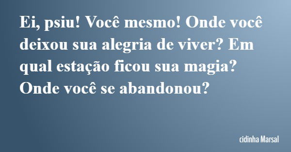 Ei, psiu! Você mesmo! Onde você deixou sua alegria de viver? Em qual estação ficou sua magia? Onde você se abandonou?
