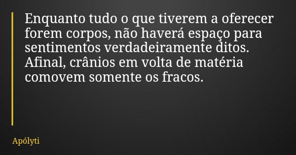 Enquanto tudo o que tiverem a oferecer forem corpos, não haverá espaço para sentimentos verdadeiramente ditos. Afinal, crânios em volta de matéria comovem somente os fracos.