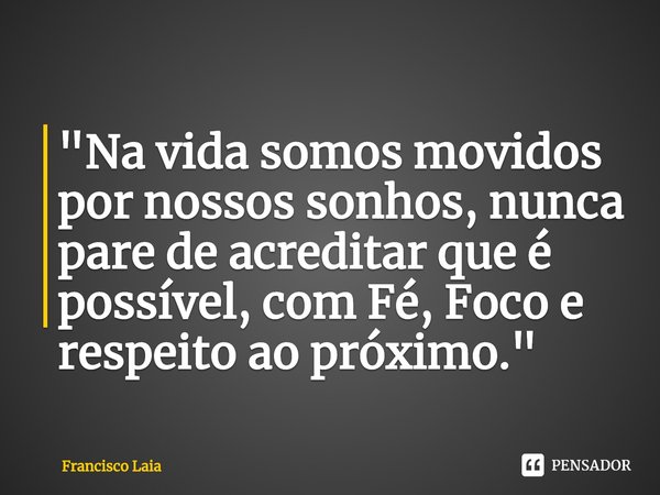 "Na vida somos movidos por nossos sonhos, nunca pare de acreditar que é possível, com Fé, Foco e respeito ao próximo."