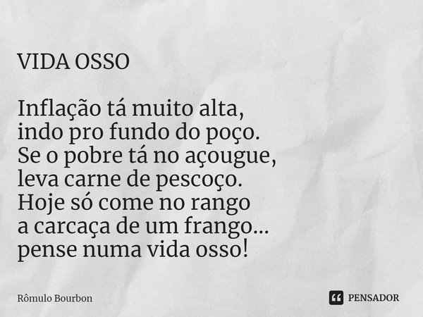 VIDA OSSO Inflação tá muito alta, indo pro fundo do poço. Se o pobre tá no açougue, leva carne de pescoço. Hoje só come no rango a carcaça de um frango... pense numa vida osso!