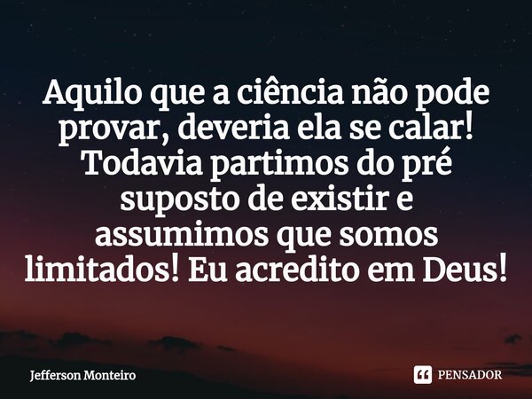 Aquilo que a ciência não pode provar, deveria ela se calar! Todavia partimos do pré suposto de existir e assumimos que somos limitados! Eu acredito em Deus!