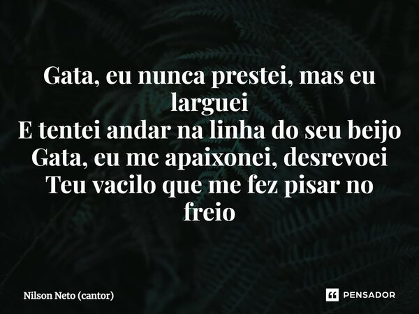 Gata, eu nunca prestei, mas eu larguei E tentei andar na linha do seu beijo Gata, eu me apaixonei, desrevoei Teu vacilo que me fez pisar no freio