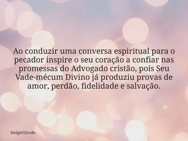 Ao conduzir uma conversa espiritual para o pecador inspire o seu coração a confiar nas promessas do Advogado cristão, pois Seu Vade-mécum Divino já produziu provas de amor, perdão, fidelidade e salvação.