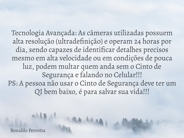 Tecnologia Avançada: As câmeras utilizadas possuem alta resolução (ultradefinição) e operam 24 horas por dia, sendo capazes de identificar detalhes precisos mesmo em alta velocidade ou em condições de pouca luz, podem multar quem anda sem o Cinto de Segurança e falando no Celular!!!