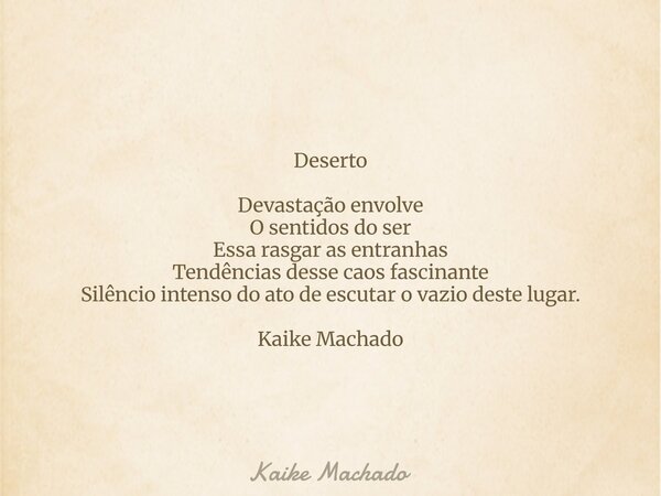Deserto Devastação envolve O sentidos do ser Essa rasgar as entranhas Tendências desse caos fascinante Silêncio intenso do ato de escutar o vazio deste lugar. Kaike Machado