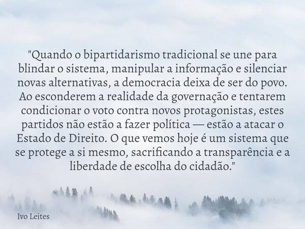 "Quando o bipartidarismo tradicional se une para blindar o sistema, manipular a informação e silenciar novas alternativas, a democracia deixa de ser do povo. Ao esconderem a realidade da governação e tentarem condicionar o voto contra novos protagonistas, estes partidos não estão a fazer política — estão a atacar o Estado de Direito. O que vemos hoje é um sistema que se protege a si mesmo, sacrificando a transparência e a liberdade de escolha do cidadão."