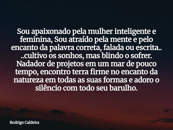 Sou apaixonado pela mulher inteligente e feminina, Sou atraído pela mente e pelo encanto da palavra correta, falada ou escrita.. ..cultivo os sonhos, mas blindo o sofrer. Nadador de projetos em um mar de pouco tempo, encontro terra firme no encanto da natureza em todas as suas formas e adoro o silêncio com todo seu barulho.