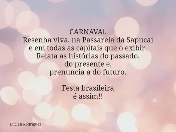 CARNAVAl, Resenha viva, na Passarela da Sapucai e em todas as capitais que o exibir. Relata as histórias do passado, do presente e, prenuncia a do futuro. Festa brasileira é assim!!