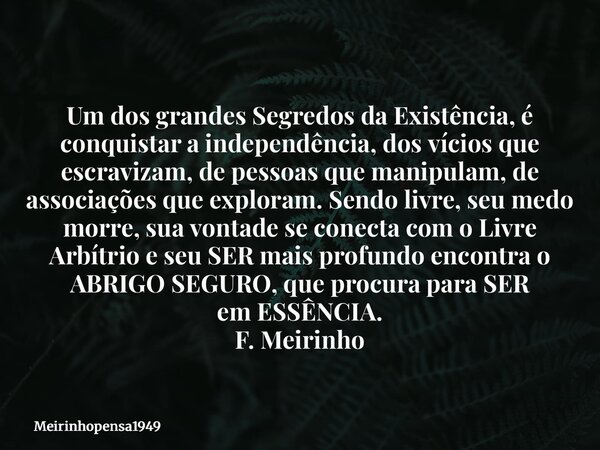Um dos grandes Segredos da Existência, é conquistar a independência, dos vícios que escravizam, de pessoas que manipulam, de associações que exploram. Sendo livre, seu medo morre, sua vontade se conecta com o Livre Arbítrio e seu SER mais profundo encontra o ABRIGO SEGURO, que procura para SER