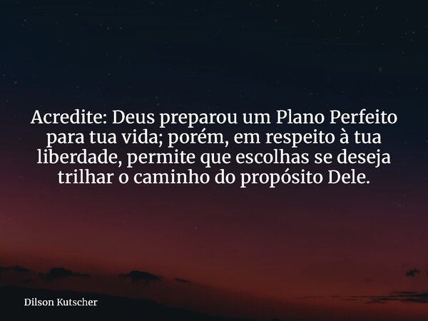 Acredite: Deus preparou um Plano Perfeito para tua vida; porém, em respeito à tua liberdade, permite que escolhas se deseja trilhar o caminho do propósito Dele.