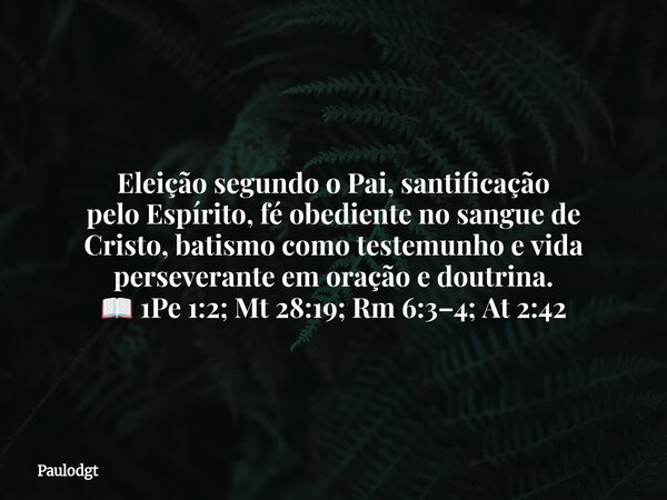 Eleição segundo o Pai, santificação pelo Espírito, fé obediente no sangue de Cristo, batismo como testemunho e vida perseverante em oração e doutrina. 📖 1Pe 1:2; Mt 28:19; Rm 6:3–4; At 2:42