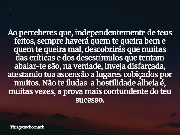 Ao perceberes que, independentemente de teus feitos, sempre haverá quem te queira bem e quem te queira mal, descobrirás que muitas das críticas e dos desestímulos que tentam abalar-te são, na verdade, inveja disfarçada, atestando tua ascensão a lugares cobiçados por muitos. Não te iludas: a hostilidade alheia é, muitas vezes, a prova mais contundente do teu sucesso.