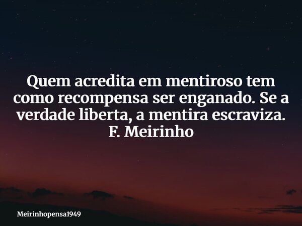 Quem acredita em mentiroso tem como recompensa ser enganado. Se a verdade liberta, a mentira escraviza. F. Meirinho