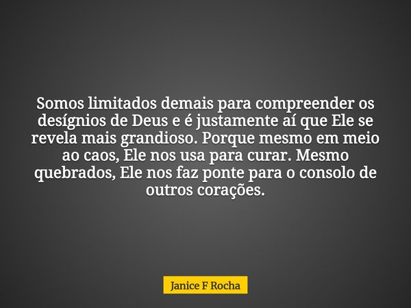 Somos limitados demais para compreender os desígnios de Deus e é justamente aí que Ele se revela mais grandioso. Porque mesmo em meio ao caos, Ele nos usa para curar. Mesmo quebrados, Ele nos faz ponte para o consolo de outros corações.