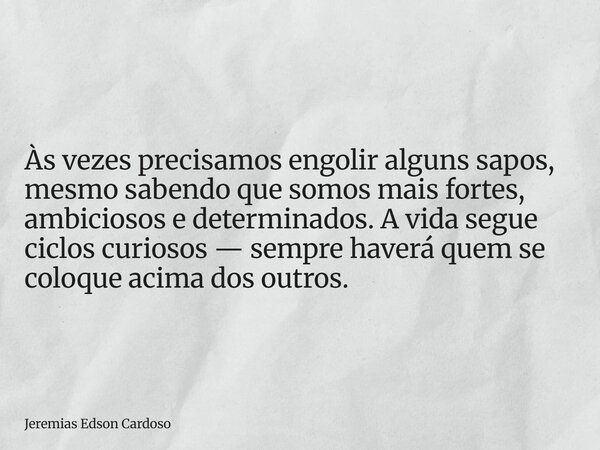 Às vezes precisamos engolir alguns sapos, mesmo sabendo que somos mais fortes, ambiciosos e determinados. A vida segue ciclos curiosos — sempre haverá quem se coloque acima dos outros.