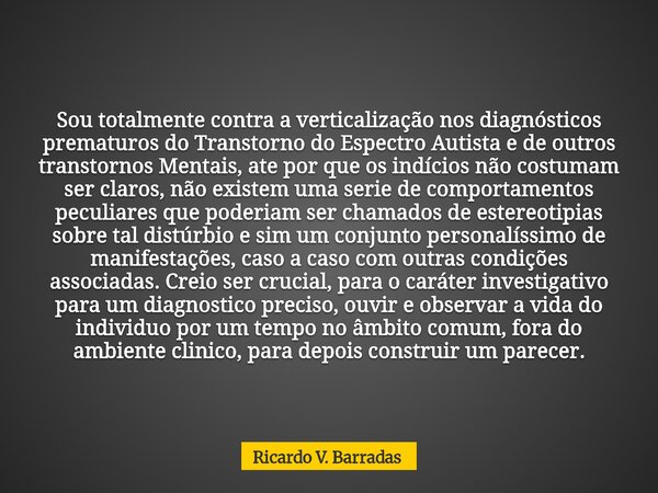Sou totalmente contra a verticalização nos diagnósticos prematuros do Transtorno do Espectro Autista e de outros transtornos Mentais, ate por que os indícios não costumam ser claros, não existem uma serie de comportamentos peculiares que poderiam ser chamados de estereotipias sobre tal distúrbio e sim um conjunto personalíssimo de manifestações, caso a caso com outras condições associadas. Creio ser crucial, para o caráter investigativo para um diagnostico preciso, ouvir e observar a vida do individuo por um tempo no âmbito comum, fora do ambiente clinico, para depois construir um parecer.