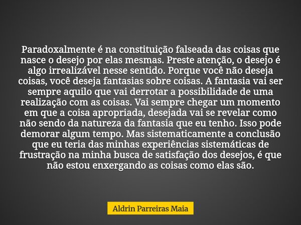 Paradoxalmente é na constituição falseada das coisas que nasce o desejo por elas mesmas. Preste atenção, o desejo é algo irrealizável nesse sentido. Porque você não deseja coisas, você deseja fantasias sobre coisas. A fantasia vai ser sempre aquilo que vai derrotar a possibilidade de uma realização com as coisas. Vai sempre chegar um momento em que a coisa apropriada, desejada vai se revelar como não sendo da natureza da fantasia que eu tenho. Isso pode demorar algum tempo. Mas sistematicamente a conclusão que eu teria das minhas experiências sistemáticas de frustração na minha busca de satisfação dos desejos, é que não estou enxergando as coisas como elas são.