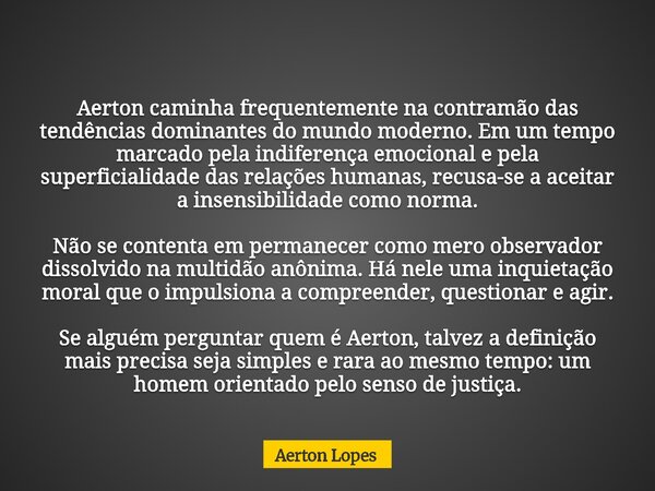 Aerton caminha frequentemente na contramão das tendências dominantes do mundo moderno. Em um tempo marcado pela indiferença emocional e pela superficialidade das relações humanas, recusa-se a aceitar a insensibilidade como norma.