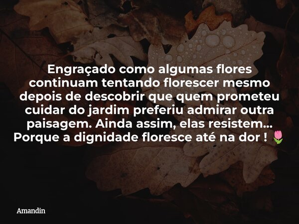 Engraçado como algumas flores continuam tentando florescer mesmo depois de descobrir que quem prometeu cuidar do jardim preferiu admirar outra paisagem. Ainda assim, elas resistem... Porque a dignidade floresce até na dor ! 🌷