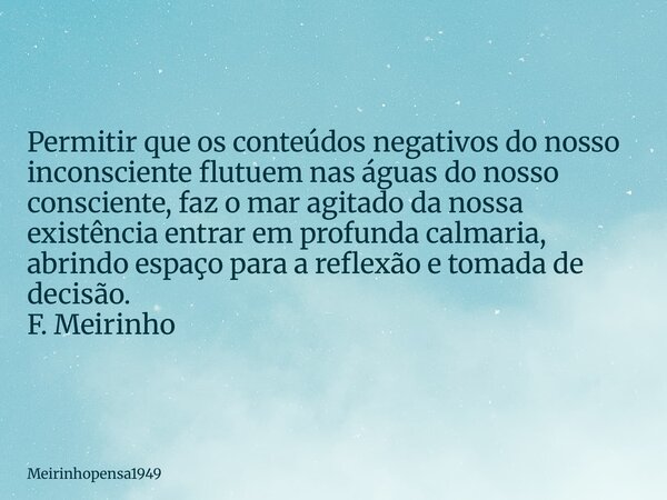 Permitir que os conteúdos negativos do nosso inconsciente flutuem nas águas do nosso consciente, faz o mar agitado da nossa existência entrar em profunda calmaria, abrindo espaço para a reflexão e tomada de decisão.