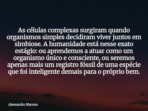 As células complexas surgiram quando organismos simples decidiram viver juntos em simbiose. A humanidade está nesse exato estágio: ou aprendemos a atuar como um organismo único e consciente, ou seremos apenas mais um registro fóssil de uma espécie que foi inteligente demais para o próprio bem.