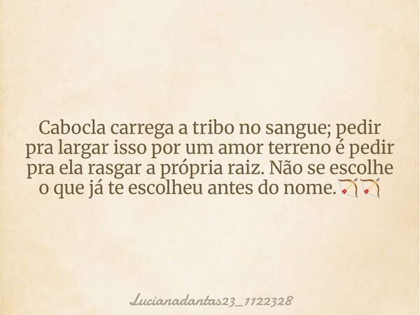 Cabocla carrega a tribo no sangue; pedir pra largar isso por um amor terreno é pedir pra ela rasgar a própria raiz. Não se escolhe o que já te escolheu antes do nome.🏹🏹