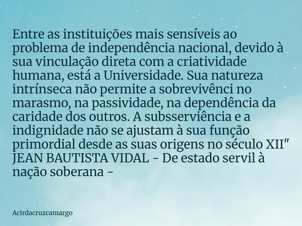 Entre as instituições mais sensíveis ao problema de independência nacional, devido à sua vinculação direta com a criatividade humana, está a Universidade. Sua natureza intrínseca não permite a sobrevivênci no marasmo, na passividade, na dependência da caridade dos outros. A subsserviência e a indignidade não se ajustam à sua função primordial desde as suas origens no século XII"