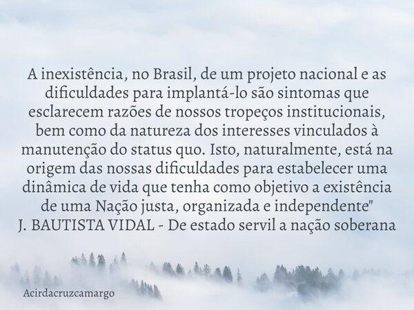 A inexistência, no Brasil, de um projeto nacional e as dificuldades para implantá-lo são sintomas que esclarecem razões de nossos tropeços institucionais, bem como da natureza dos interesses vinculados à manutenção do status quo. Isto, naturalmente, está na origem das nossas dificuldades para estabelecer uma dinâmica de vida que tenha como objetivo a existência de uma Nação justa, organizada e independente"