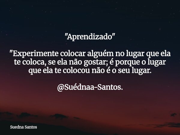 "Aprendizado" "Experimente colocar alguém no lugar que ela te coloca, se ela não gostar; é porque o lugar que ela te colocou não é o seu lugar. @Suédnaa-Santos.