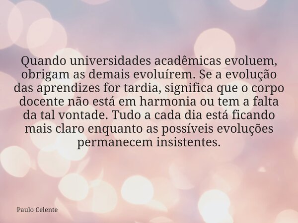Quando universidades acadêmicas evoluem, obrigam as demais evoluírem. Se a evolução das aprendizes for tardia, significa que o corpo docente não está em harmonia ou tem a falta da tal vontade. Tudo a cada dia está ficando mais claro enquanto as possíveis evoluções permanecem insistentes.