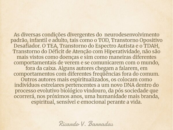 As diversas condições divergentes do neurodesenvolvimento padrão, infantil e adulto, tais como o TOD, Transtorno Opositivo Desafiador. O TEA, Transtorno do Espectro Autista e o TDAH, Transtorno do Déficit de Atenção com Hiperatividade, não são mais vistos como doenças e sim como maneiras diferentes comportamentais de verem e se comunicarem com o mundo, fora da caixa. Alguns autores chegam a falarem, em comportamentos com diferentes freqüências fora do comum. Outros autores mais espiritualizados, os colocam como indivíduos estrelares pertencentes a um novo DNA dentro do processo evolutivo biológico vindouro, da pós sociedade que ocorrerá, nos próximos anos, uma humanidade mais branda, espiritual, sensível e emocional perante a vida.