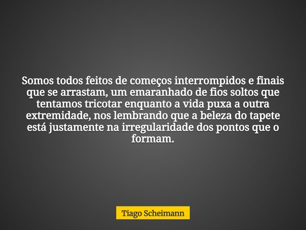 Somos todos feitos de começos interrompidos e finais que se arrastam, um emaranhado de fios soltos que tentamos tricotar enquanto a vida puxa a outra extremidade, nos lembrando que a beleza do tapete está justamente na irregularidade dos pontos que o formam.