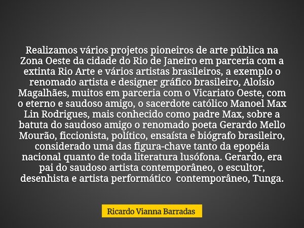 Realizamos vários projetos pioneiros de arte pública na Zona Oeste da cidade do Rio de Janeiro em parceria com a extinta Rio Arte e vários artistas brasileiros, a exemplo o renomado artista e designer gráfico brasileiro, Aloísio Magalhães, muitos em parceria com o Vicariato Oeste, com o eterno e saudoso amigo, o sacerdote católico Manoel Max Lin Rodrigues, mais conhecido como padre Max,sobre a batuta do saudoso amigo o renomado poeta Gerardo Mello Mourão, ficcionista, político, ensaísta e biógrafo brasileiro, considerado uma das figura-chave tanto da epopéia nacional quanto de toda literatura lusófona. Gerardo, era pai do saudoso artista contemporâneo, o escultor, desenhista e artista performático contemporâneo, Tunga.