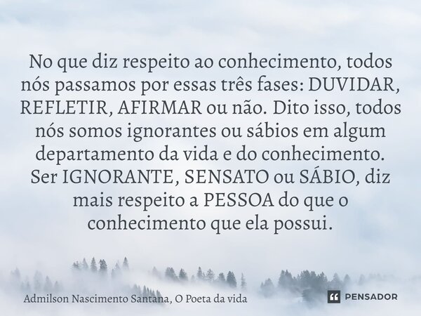 No que diz respeito ao conhecimento, todos nós passamos por essas três fases: DUVIDAR, REFLETIR, AFIRMAR ou não. Dito isso, todos nós somos ignorantes ou sábios em algum departamento da vida e do conhecimento.
