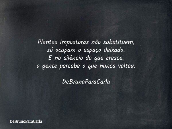 Plantas impostoras não substituem, só ocupam o espaço deixado. E no silêncio do que cresce, a gente percebe o que nunca voltou. DeBrunoParaCarla