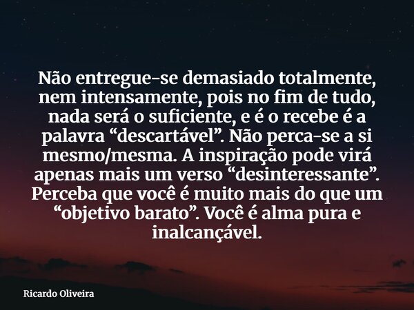 Não entregue-se demasiado totalmente, nem intensamente, pois no fim de tudo, nada será o suficiente, e é o recebe é a palavra “descartável”. Não perca-se a si mesmo/mesma. A inspiração pode virá apenas mais um verso “desinteressante”. Perceba que você é muito mais do que um “objetivo barato”. Você é alma pura e inalcançável.