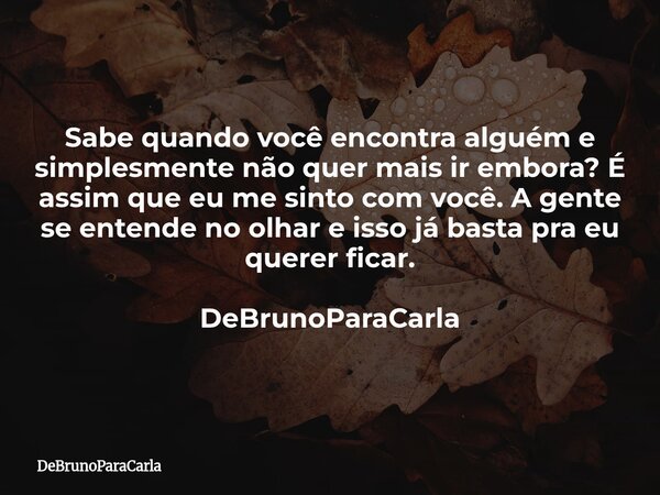 Sabe quando você encontra alguém e simplesmente não quer mais ir embora? É assim que eu me sinto com você. A gente se entende no olhar e isso já basta pra eu querer ficar. DeBrunoParaCarla